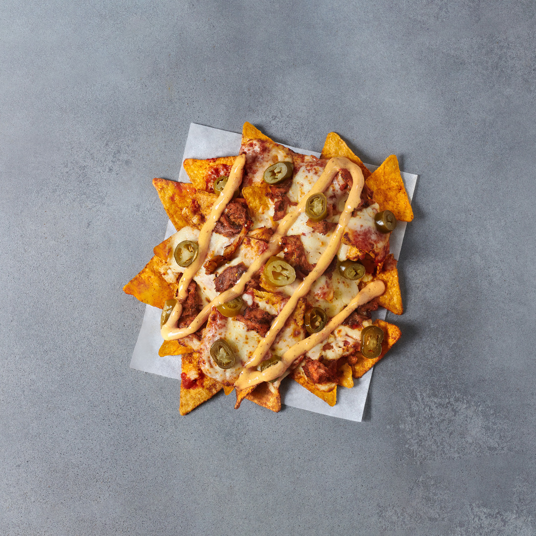 Taco-spiced pulled chicken, mozzarella, green jalapeños and Domino’s tomato sauce loaded onto tortilla chips and topped with a spiced mayo drizzle.